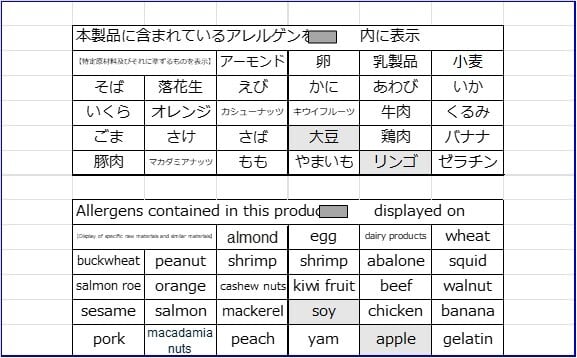 アーモンド、あわび、いか、いくら、オレンジ、カシューナッツ、キウイフルーツ、牛肉、ごま、さけ、さば、鶏肉、バナナ、豚肉、まつたけ、もも、やまいも、ゼラチン